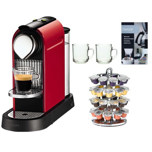 Nespresso Citiz C111 Fire Engine Red + 2 Piece 10 oz. ARC Handy Glass Coffe Mug + 40 Capsule Coffee Carousel + Urnex Dezcal Home Activated Coffee/Espresso Descaler
