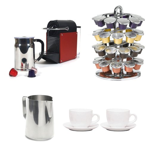 Nespresso Pixie D60 Carmine Espresso Machinea & Aero Bundle Dark Red + Set Of 6 Espresso Cups & Saucers Tri Color + 40 Capsule Coffee Carousel