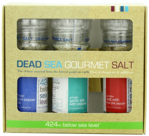 This Salt 424 package includes 3 glass grinders filled with the following Gourmet flavored Dead Sea salts: 1 – Gourmet Black Pepper: The classic combination of white salt and natural black pepper enriches any dish. For daily use in seasoning and cooking all types of foods. Also available...